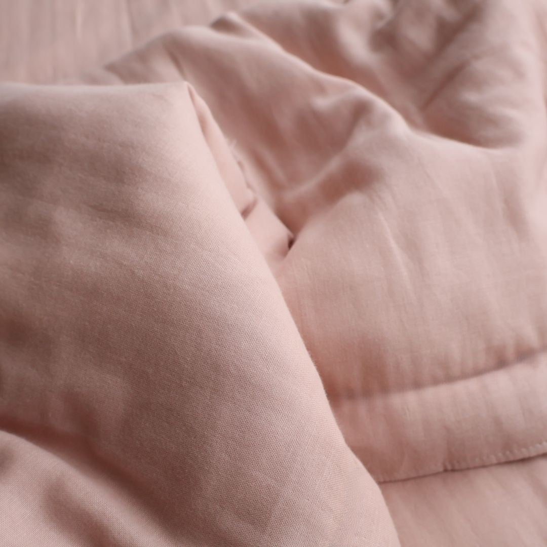 このスフレガーゼの生地に、職人が丁寧にわたを入れ、掛け布団に仕上げます。中わたが入ることで、ふっくらと安心感ある使い心地に。生地の心地よさを最大限楽しみながら、気持ちよくお使いいただけます。