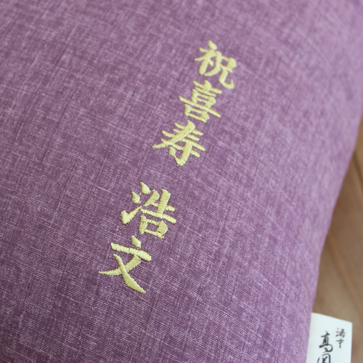 定番の祝○○(還暦などの節目)やお名前の名入れ刺繍に加え、四文字熟語や贈る方へのメッセージなど型にハマらない、ユニークな刺繍も素敵です。