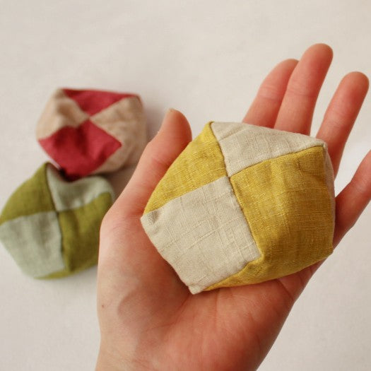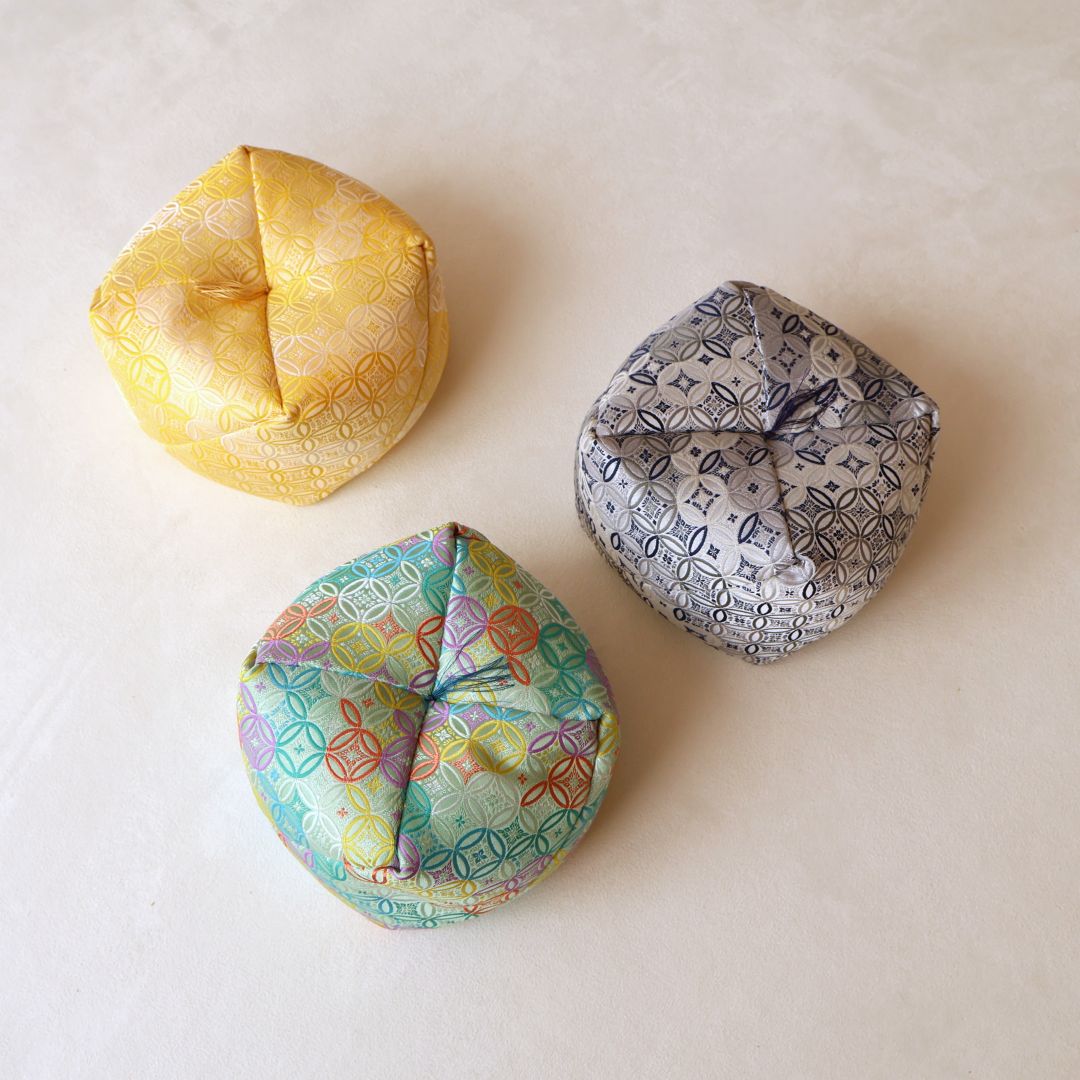 そんなお手玉の形にインスピレーションを得て生まれたおじゃみシリーズ。お座布団として、クッションとして、インテリアのアクセントとして――