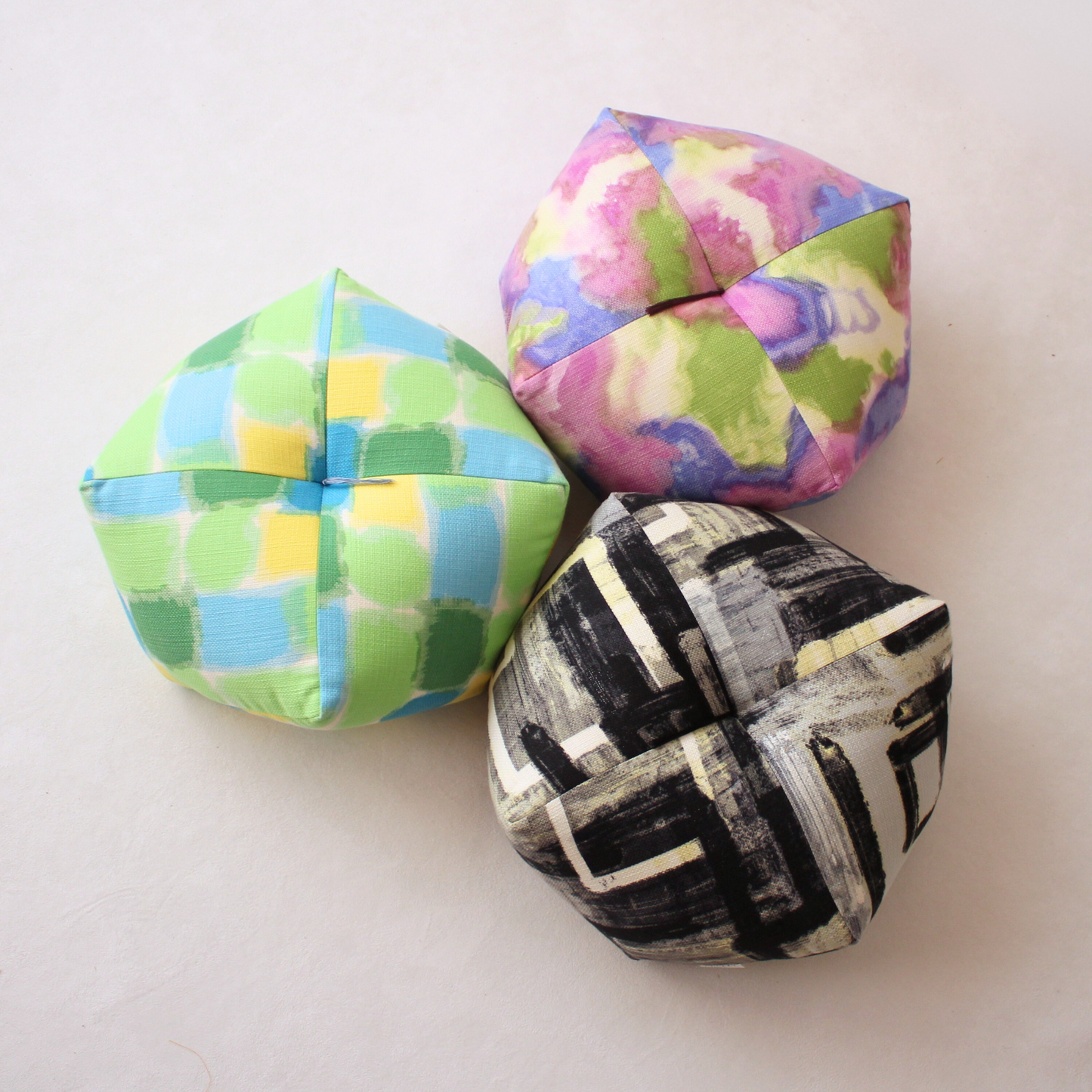 立体的で、遊び心ある、お手玉型のデザイン。おじゃみには、受け継いできた座布団作りの技が、ぎゅっと詰まっています。