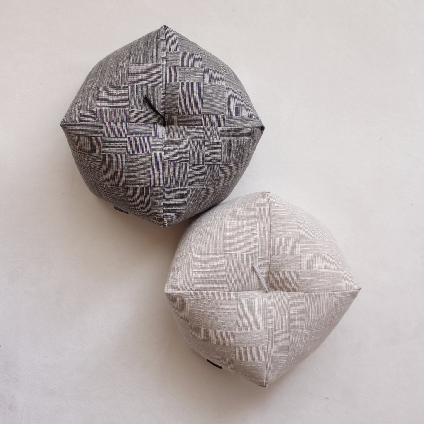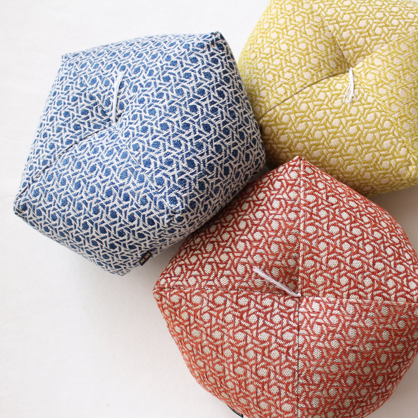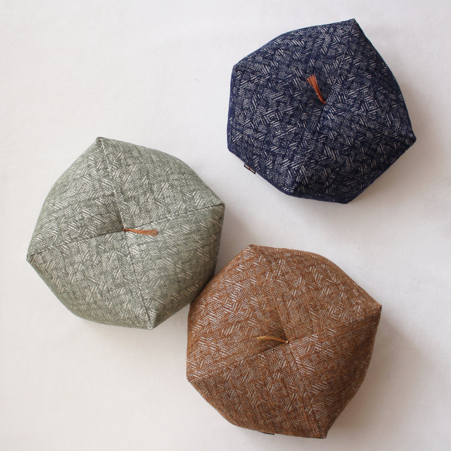関西で「お手玉」を意味する“おじゃみ”をモチーフにしたお座布団。4枚の布を縫い合わせて仕立てる八角形のユニークなかたちは、どこか端正でぬくもりある佇まいが魅力。昔ながらの職人の手仕事で仕立てた、洛中高岡屋を代表する寛具(かんぐ)です。