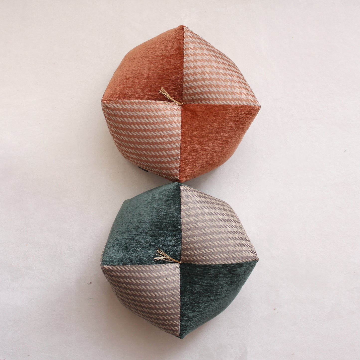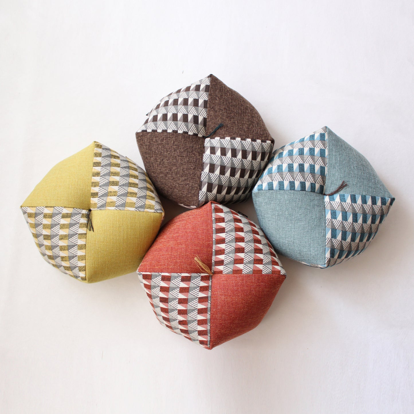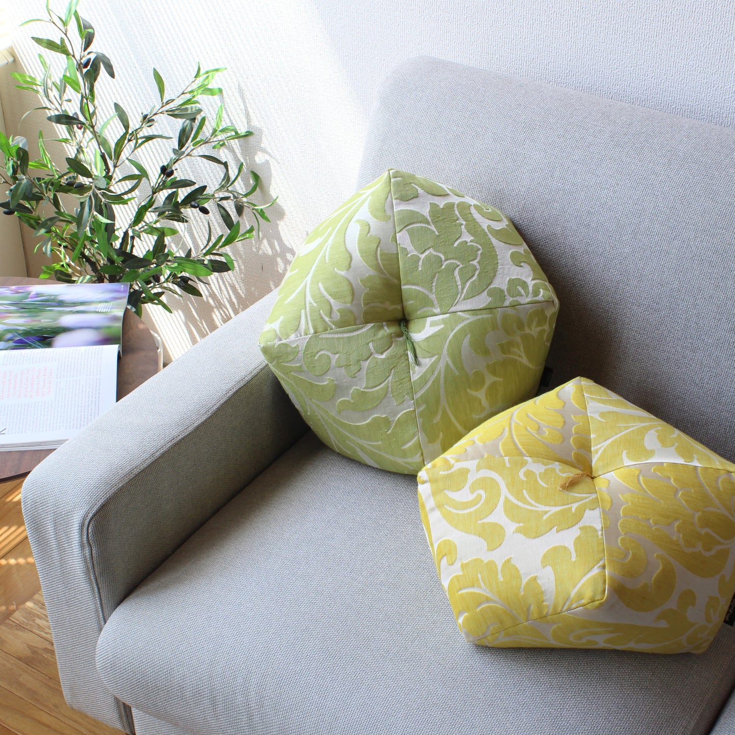 関西で「お手玉」を意味する“おじゃみ”をモチーフにしたお座布団。4枚の布を縫い合わせて仕立てる八角形のユニークなかたちは、どこか端正でぬくもりある佇まいが魅力。昔ながらの職人の手仕事で仕立てた、洛中高岡屋を代表する寛具(かんぐ)です。
