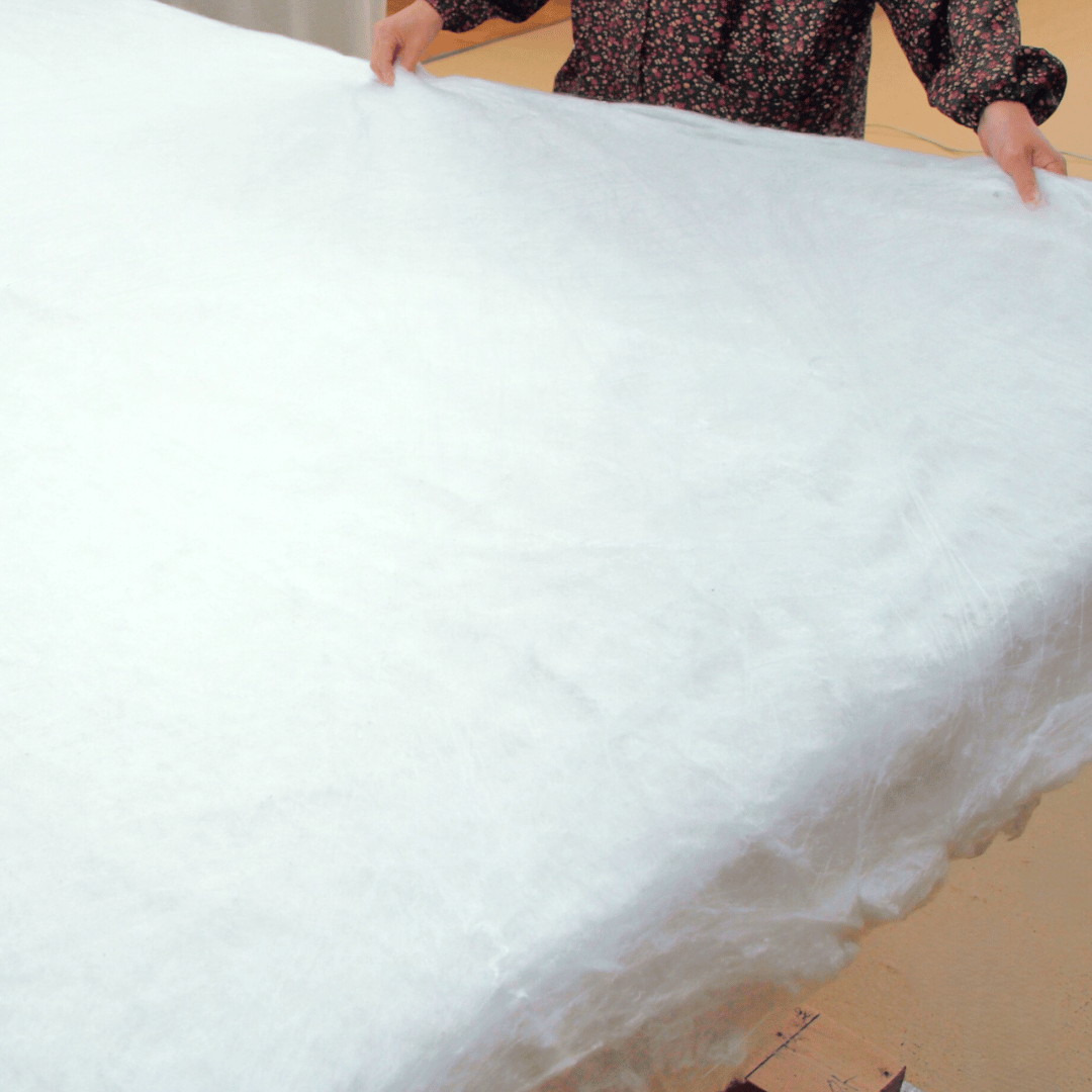 繭を丁寧に引き延ばし、何層にも重ねて生まれる真綿(まわた)。