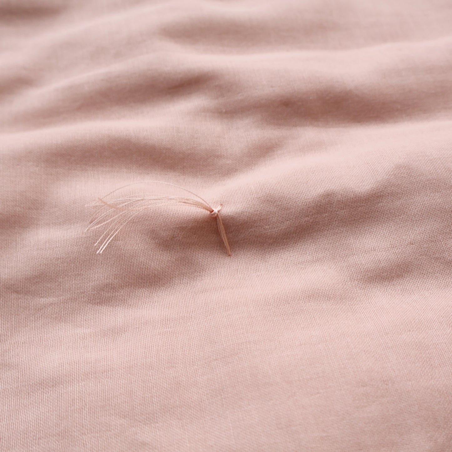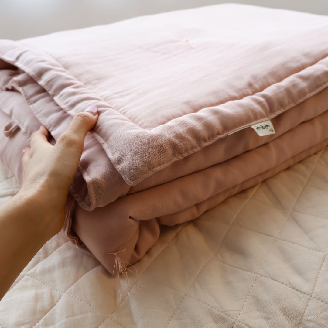 このスフレガーゼの生地に、職人が丁寧にわたを入れ、掛け布団に仕上げます。中わたが入ることで、ふっくらと安心感ある使い心地に。生地の心地よさを最大限楽しみながら、気持ちよくお使いいただけます。